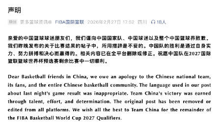 2月27日,FIBA国际篮联官方微信发布致歉声明,内容如下: 亲爱的中国篮球球迷朋友们,我们谨向中国国家队、中国球迷以及整个中国篮球界致歉。我们昨晚发布的关于比赛结果的帖子中,所用措辞是不妥的。中国队的胜利是通过自身实力、努力拼搏和决心而赢得的。相关内容已在全平台删除或修正。祝愿中国队在2027国际篮联篮球世界杯预选赛剩余比赛中一切顺利。 在26日晚上进行的FIBA男篮世界杯预选赛中,中国男篮在一度落后15分的情况下,实现了下半场大反击,从而以87比80逆转了日本男篮。尤其在最后时刻,现场裁判做出了多个不利于中国男篮的吹罚,但是中国男篮顶住压力赢下比赛。 然而赛后,FIBA世界杯的社交媒体官方账号却写道:“冲绳神剧本!中国男篮从日本偷走一场胜利。”(China with a sneaky win over Japan),“Sneaky”一词隐含“鬼祟、卑鄙”的贬义,被质疑暗指中国队胜之不武,引发评论区翻车。 后来在各国网友的指责下,FIBA世界杯才将文案改成“中国男篮在下半场翻盘,击败日本队”。(综合)